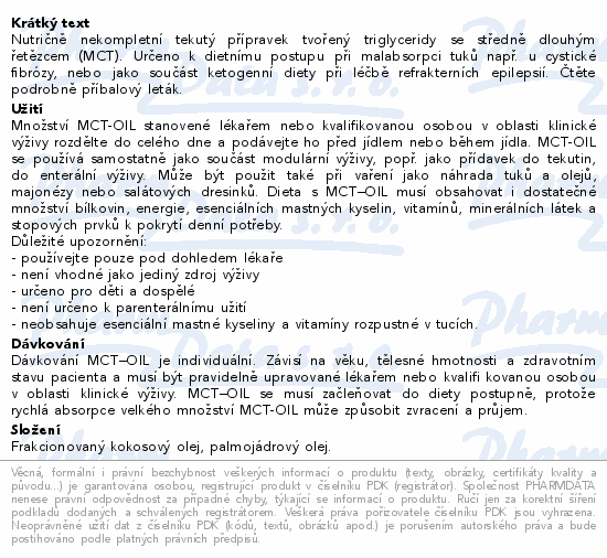 Nutričně nekompletní tekutý přípravek tvořený triglyceridy se středně dlouhým řetězcem (MCT). Určeno k dietnímu postupu při malabsorpci tuků např. u cystické fibrózy, nebo jako součást ketogenní diety při léčbě refrakterních epilepsií. Čtěte pozorně příbalový leták.
