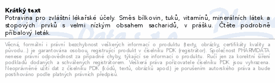 Potravina pro zvláštní lékařské účely. Směs bílkovin, tuků, vitamínů, minerálních látek a stopových prvků s velmi nízkým obsahem sacharidů, v prášku. Čtěte pozorně příbalový leták.