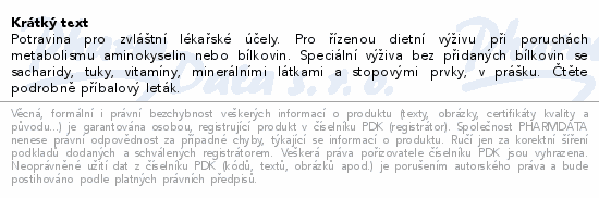 Potravina pro zvláštní lékařské účely. Pro řízenou dietní výživu při poruchách metabolismu aminokyselin nebo bílkovin. Speciální výživa bez přidaných bílkovin se sacharidy, tuky, vitamíny, minerálními látkami a stopovými prvky, v prášku. Čtěte pozorně příbalový leták.