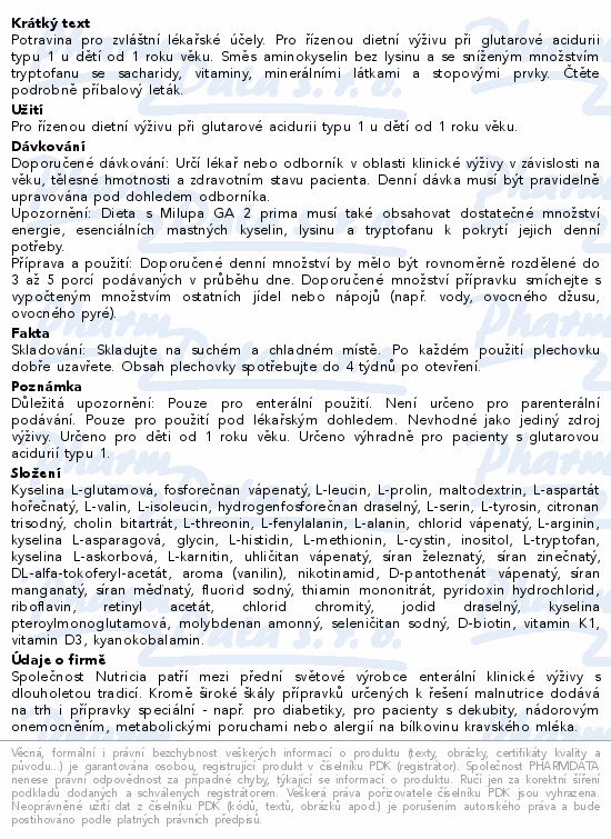 Potravina pro zvláštní lékařské účely. Pro řízenou dietní výživu při glutarové acidurii typu 1 u dětí od 1 roku věku. Směs aminokyselin bez lysinu a se sníženým množstvím tryptofanu se sacharidy, vitaminy, minerálními látkami a stopovými prvky. Čtěte pozorně příbalový leták.