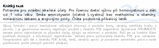 Potravina pro zvláštní lékařské účely. Pro řízenou dietní výživu při homocystinurii u dětí od 1 roku věku. Směs aminokyselin (včetně L-cystinu) bez methioninu s vitamíny, minerálními látkami a stopovými prvky. Čtěte pozorně příbalový leták.