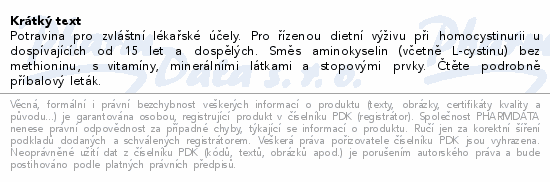 Potravina pro zvláštní lékařské účely. Pro řízenou dietní výživu při homocystinurii u dospívajících od 15 let a dospělých. Směs aminokyselin (včetně L-cystinu) bez methioninu, s vitamíny, minerálními látkami a stopovými prvky. Čtěte pozorně příbalový leták.