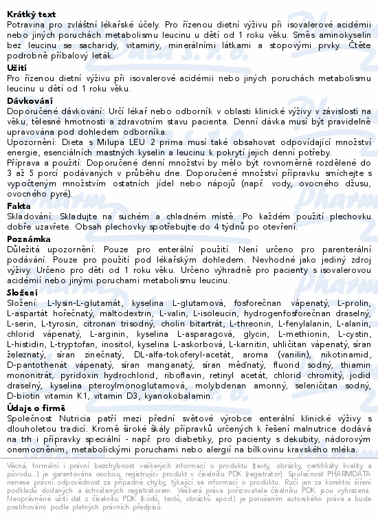 Potravina pro zvláštní lékařské účely. Pro řízenou dietní výživu při isovalerové acidémii nebo jiných poruchách metabolismu leucinu u dětí od 1 roku věku. Směs aminokyselin bez leucinu se sacharidy, vitaminy, minerálními látkami a stopovými prvky. Čtěte pozorně příbalový leták.