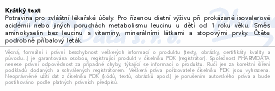 Potravina pro zvláštní lékařské účely. Pro řízenou dietní výživu při prokázané isovalerové acidémii nebo jiných poruchách metabolismu leucinu u dětí od 1 roku věku. Směs aminokyselin bez leucinu s vitaminy, minerálními látkami a stopovými prvky. Čtěte pozorně příbalový leták.