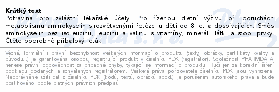 Potravina pro zvláštní lékařské účely. Pro řízenou dietní výživu při poruchách metabolismu aminokyselin s rozvětvenými řetězci u dětí od 8 let a dospívajících. Směs aminokyselin bez isoleucinu, leucinu a valinu s vitamíny, minerál. látk. a stop. prvky. Čtěte pozorně příbalový leták.
