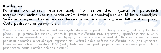 Potravina pro zvláštní lékařské účely. Pro řízenou dietní výživu při poruchách metabolismu aminokyselin s rozvětvenými řetězci u dospívajících od 15 let a dospělých. Směs aminokyselin bez isoleucinu, leucinu a valinu s vitamíny, min. látk. a stop. prvky. Čtěte pozorně příbalový leták.