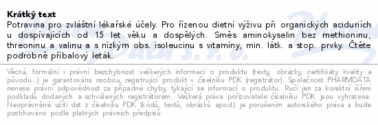 Potravina pro zvláštní lékařské účely. Pro řízenou dietní výživu při organických aciduriích u dospívajících od 15 let věku a dospělých. Směs aminokyselin bez methioninu, threoninu a valinu a s nízkým obs. isoleucinu s vitamíny, min. látk. a stop. prvky. Čtěte pozorně příbalový leták.