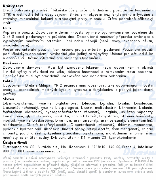 Dietní potravina pro zvláštní lékařské účely. Určeno k dietnímu postupu při tyrosinémii (TYR) u dětí od 8 let a dospívajících. Směs aminokyselin bez fenylalaninu a tyrosinu s vitamíny, minerálními látkami a stopovými prvky, v prášku. Čtěte pozorně příbalový leták.