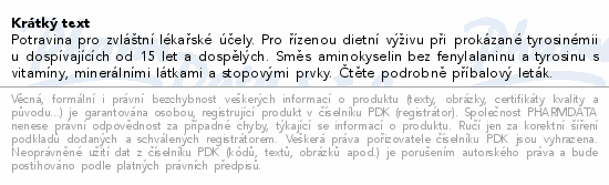 Potravina pro zvláštní lékařské účely. Pro řízenou dietní výživu při prokázané tyrosinémii u dospívajících od 15 let a dospělých. Směs aminokyselin bez fenylalaninu a tyrosinu s vitamíny, minerálními látkami a stopovými prvky. Čtěte pozorně příbalový leták.