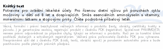 Potravina pro zvláštní lékařské účely. Pro řízenou dietní výživu při poruchách cyklu močoviny u dětí od 8 let a dospívajících. Směs esenciálních aminokyselin s vitaminy, minerálními látkami a stopovými prvky. Čtěte pozorně příbalový leták.