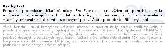 Potravina pro zvláštní lékařské účely. Pro řízenou dietní výživu při poruchách cyklu močoviny u dospívajících od 15 let a dospělých. Směs esenciálních aminokyselin s vitaminy, minerálními látkami a stopovými prvky. Čtěte pozorně příbalový leták.