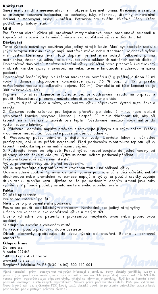 Směs esenciálních a neesenciálních aminokyselin bez methioninu, threoninu a valinu a se sníženým obsahem isoleucinu, se sacharidy, tuky, vlákninou, vitamíny, minerálními látkami a stopovými prvky, v prášku. Čtěte pozorně příbalový leták.