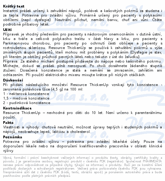 Instantní prášek určený k zahuštění nápojů, polévek a kašovitých pokrmů za studena i za tepla. Potravina pro zvláštní výživu. Primárně určený pro pacienty s polykacími obtížemi (např. dysfagie). Neutrální příchuť, nemění barvu, chuť ani vůni. Čtěte pozorně příbalový leták.