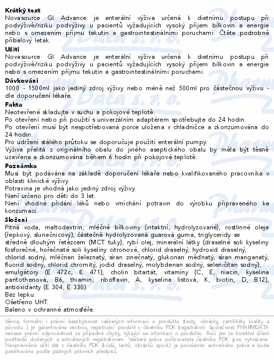 Novasource GI Advance 500ml je enterální výživa určená k dietnímu postupu při podvýživě/riziku podvýživy u pacientů vyžadujících vysoký příjem bílkovin a energie nebo s omezením příjmu tekutin a gastrointestinálními poruchami. Čtěte pozorně příbalový leták.