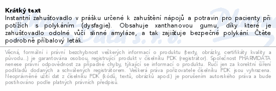 Instantní zahušťovadlo v prášku určené k zahuštění nápojů a potravin pro pacienty při potížích s polykáním (dysfagie). Obsahuje xanthanovou gumu, díky které je zahušťovadlo odolné vůči slinné amyláze, a tak zajišťuje bezpečné polykání. Čtěte pozorně příbalový leták.