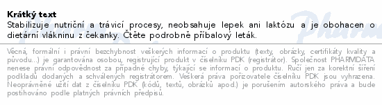 Stabilizuje nutriční a trávicí procesy, neobsahuje lepek ani laktózu a je obohacen o dietární vlákninu z čekanky. Čtěte pozorně příbalový leták.