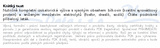 Nutričně kompletní izokalorická výživa s vysokým obsahem bílkovin (kvalitní syrovátkový protein) a sníženým množstvím elektrolytů (fosfor, draslík, sodík). Čtěte pozorně příbalový leták.