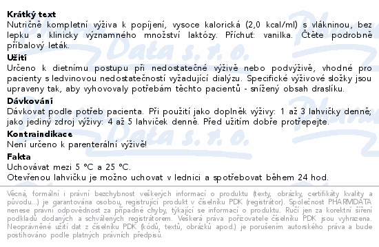 Nutričně kompletní výživa k popíjení, vysoce kalorická (2,0 kcal/ml) s vlákninou, bez lepku a klinicky významného množství laktózy. Příchuť: vanilka. Čtěte pozorně příbalový leták.