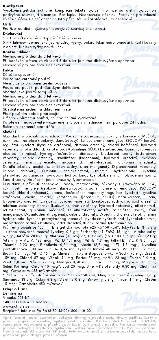 Vysokoenergetická nutričně kompletní tekutá výživa. Pro řízenou dietní výživu při podvýživě související s nemocí. Bez lepku. Neobsahuje vlákninu. Potravina pro zvláštní lékařské účely. Balení obsahuje tyto příchutě: 3x čokoládová, 3x banánová.
