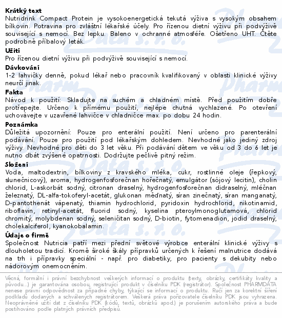 Nutridrink Compact Protein je vysokoenergetická tekutá výživa s vysokým obsahem bílkovin. Potravina pro zvláštní lékařské účely. Pro řízenou dietní výživu při podvýživě související s nemocí. Bez lepku. Baleno v ochranné atmosféře. Ošetřeno UHT. Čtěte pozorně příbalový leták.
