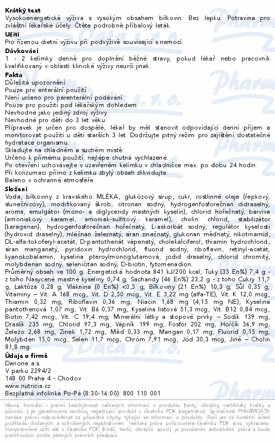 Vysokoenergetická výživa s vysokým obsahem bílkovin. Bez lepku. Potravina pro zvláštní lékařské účely. Čtěte pozorně příbalový leták.