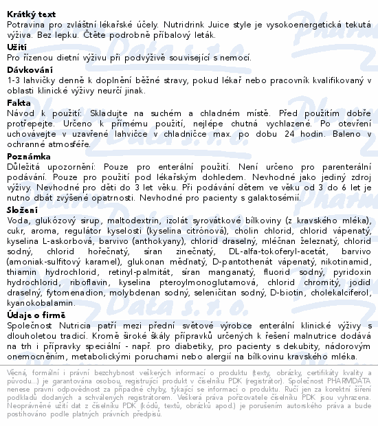 Potravina pro zvláštní lékařské účely. Nutridrink Juice style je vysokoenergetická tekutá výživa. Bez lepku. Čtěte pozorně příbalový leták.