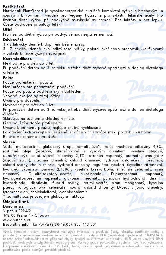 Nutridrink PlantBased je vysokoenergetická nutričně kompletní výživa s hrachovými a sójovými bílkovinami, vhodná pro vegany. Potravina pro zvláštní lékařské účely. Pro řízenou dietní výživu při podvýživě související se nemocí. Bez laktózy a bez lepku.