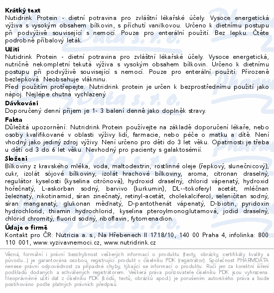 Nutidrink Protein - dietní potravina pro zvláštní lékařské účely. Vysoce energetická výživa s vysokým obsahem bílkovin, s příchutí vanilkovou. Určeno k dietnímu postupu při podvýživě související s nemocí. Pouze pro enterální použití. Bez lepku. Čtěte pozorně příbalový leták.