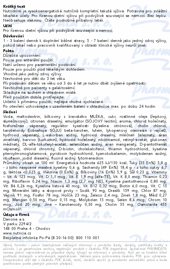 Nutridrink je vysokoenergetická nutričně kompletní tekutá výživa. Potravina pro zvláštní lékařské účely. Pro řízenou dietní výživu při podvýživě související se nemocí. Bez lepku. Neobsahuje vlákninu. Čtěte pozorně příbalový leták.