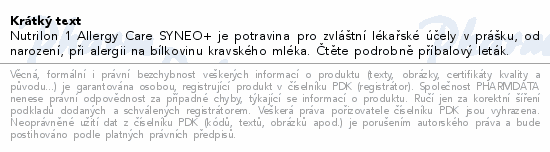 Nutrilon 1 Allergy Care SYNEO+ je potravina pro zvláštní lékařské účely v prášku, od narození, při alergii na bílkovinu kravského mléka. Čtěte pozorně příbalový leták.
