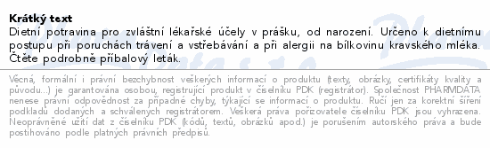 První od narození. Dietní potravina pro zvláštní lékařské účely v prášku, od narození. Určeno k dietnímu postupu při poruchách trávení a vstřebávání a při alergii na bílkovinu kravského mléka. Čtěte pozorně příbalový leták.