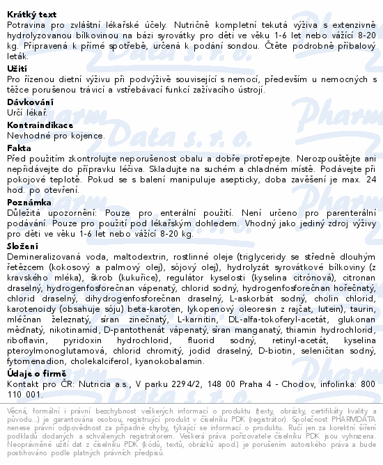 Potravina pro zvláštní lékařské účely. Nutričně kompletní tekutá výživa s extenzivně hydrolyzovanou bílkovinou na bázi syrovátky pro děti ve věku 1-6 let nebo vážící 8-20 kg. Připravená k přímé spotřebě, určená k podání sondou. Čtěte pozorně příbalový leták.