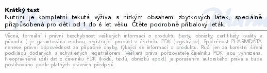 Nutrini je kompletní tekutá výživa s nízkým obsahem zbytkových látek, speciálně přizpůsobená pro děti od 1 do 6 let věku. Čtěte pozorně příbalový leták.