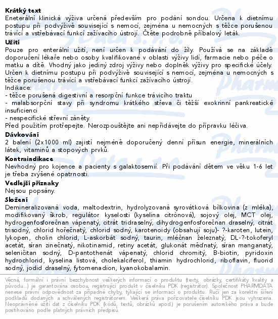 Eneterální klinická výživa určená především pro podání sondou. Určena k dietnímu postupu při podvýživě související s nemocí, zejména u nemocných s těžce porušenou trávící a vstřebávací funkcí zažívacího ústrojí. Čtěte pozorně příbalový leták.