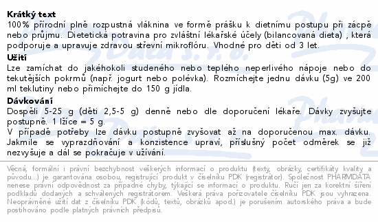 Dávkování: jedna odměrka (5 g) do 200 ml tekutiny nebo 150 g jídla. Pokud je to potřeba dávky se zvyšují postupně. až na doporučenou maximální dávku (5 odměrek denně). OptiFibre je zcela bez lepku, laktózy i fruktózy.