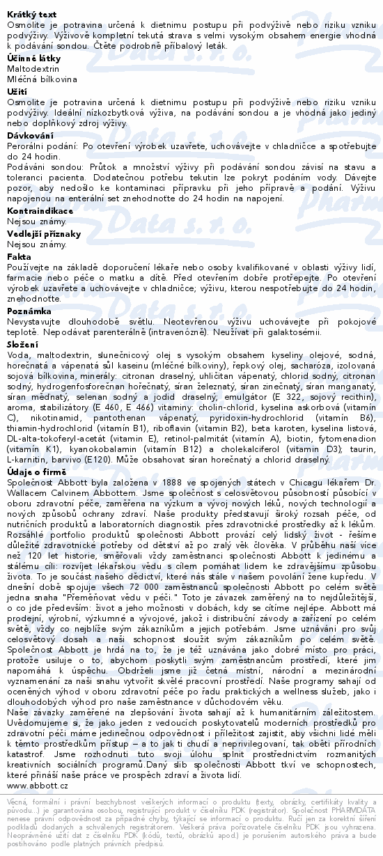 Osmolite je potravina určená k dietnimu postupu při podvýživě nebo riziku vzniku podvýživy. Výživově kompletní tekutá strava s velmi vysokým obsahem energie vhodná k podávání sondou. Čtěte pozorně příbalový leták.