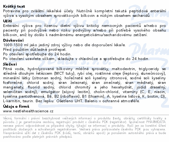 Potravina pro zvláštní lékařské účely. Nutričně kompletní tekutá peptidová enterální výživa s vysokým obsahem syrovátkových bílkovin a nízkým obsahem sacharidů.