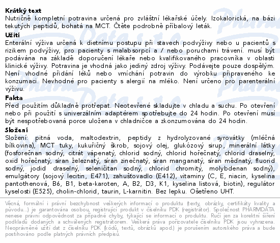Nutričně kompletní potravina určená pro zvláštní lékařské účely. Izokalorická, na bázi tekutých peptidů, bohatá na MCT. Čtěte pozorně příbalový leták.