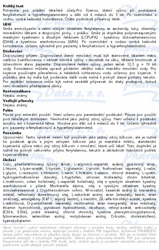 Potravina pro zvláštní lékařské účely.Pro řízenou dietní výživu při prokázané fenylketonurii a hyperfenylalaninémii u dětí od 6 měsíců do 5 let. Po rozmíchání s vodou vzniká kašovitá konzistence. Čtěte pozorně příbalový leták.