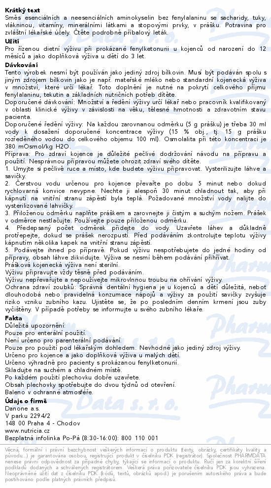 Potravina pro zvláštní lékařské účely. Směs esenciálních a neesenciálních aminokyselin bez fenylalaninu se sacharidy, tuky, vlákninou, vitamíny, minerálními látkami a stopovými prvky, v prášku. Čtěte pozorně příbalový leták.