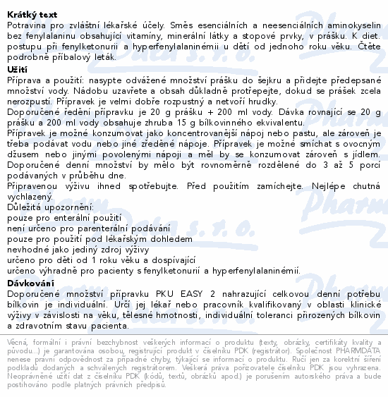 Potravina pro zvláštní lékařské účely. Směs esenciálních a neesenciálních aminokyselin bez fenylalaninu obsahující vitamíny, minerální látky a stopové prvky, v prášku. K diet. postupu při fenylketonurii a hyperfenylalaninémii u dětí od jednoho roku věku. Čtěte pozorně příbalový leták.