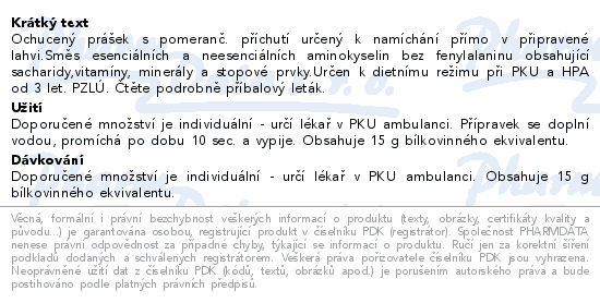 Ochucený prášek s pomeranč. příchutí určený k namíchání přímo v připravené lahvi.Směs esenciálních a neesenciálních aminokyselin bez fenylalaninu obsahující sacharidy,vitamíny, minerály a stopové prvky.Určen k dietnímu režimu při PKU a HPA od 3 let. PZLÚ. Čtěte pozorně příbalový leták.