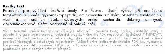 Potravina pro zvláštní lékařské účely. Pro řízenou dietní výživu při prokázané fenylketonurii. Směs glykomakropeptidu, aminokyselin s nízkým obsahem fenylalaninu, vitamínů, minerálních látek, stopových prvků, sacharidů, vlákniny a kysel. dokosahexaenové. Čtěte pozorně příbalový leták.