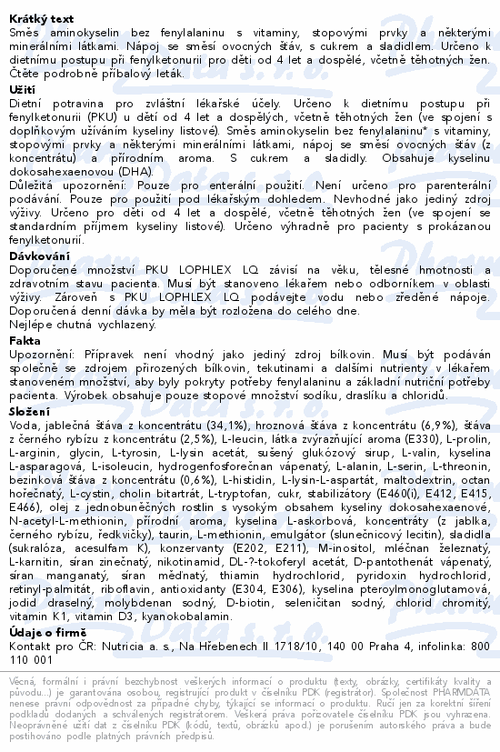 Směs aminokyselin bez fenylalaninu s vitaminy, stopovými prvky a některými minerálními látkami. Nápoj se směsí ovocných šťáv, s cukrem a sladidlem. Určeno k dietnímu postupu při fenylketonurii pro děti od 4 let a dospělé, včetně těhotných žen. Čtěte pozorně příbalový leták.