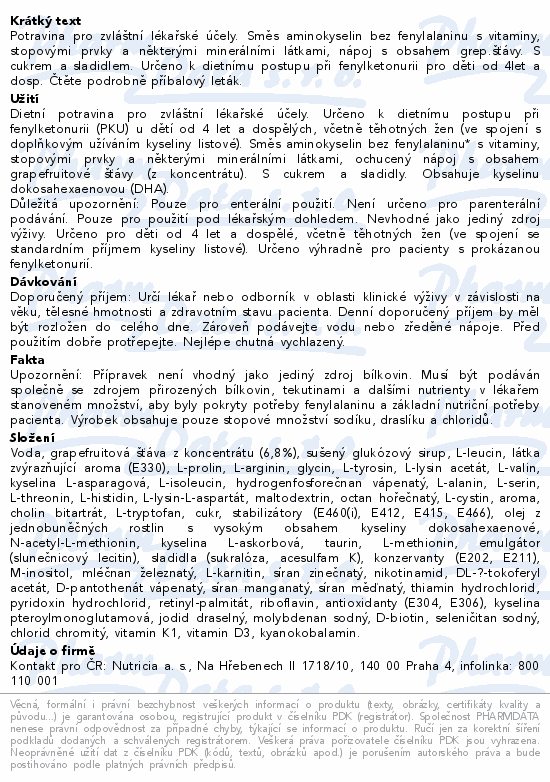 Potravina pro zvláštní lékařské účely. Směs aminokyselin bez fenylalaninu s vitaminy, stopovými prvky a některými minerálními látkami, nápoj s obsahem grep.šťávy. S cukrem a sladidlem. Určeno k dietnímu postupu při fenylketonurii pro děti od 4let a dosp. Čtěte pozorně příbalový leták.