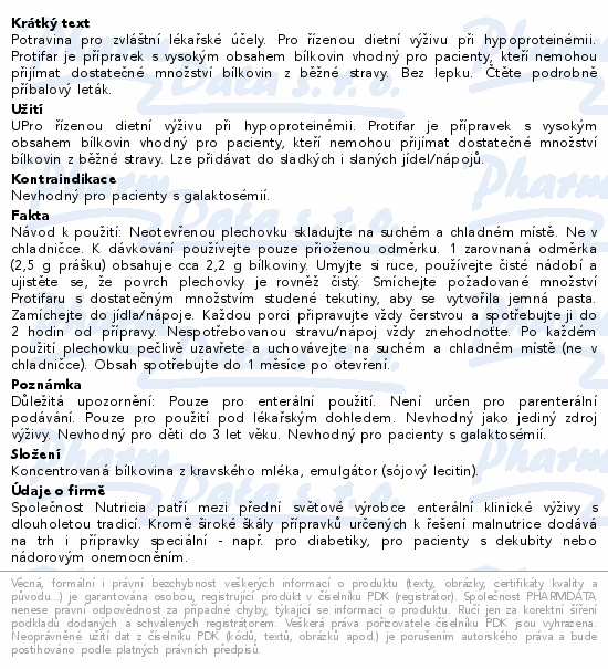 Potravina pro zvláštní lékařské účely. Pro řízenou dietní výživu při hypoproteinémii. Protifar je přípravek s vysokým obsahem bílkovin vhodný pro pacienty, kteří nemohou přijímat dostatečné množství bílkovin z běžné stravy. Bez lepku. Čtěte pozorně příbalový leták.