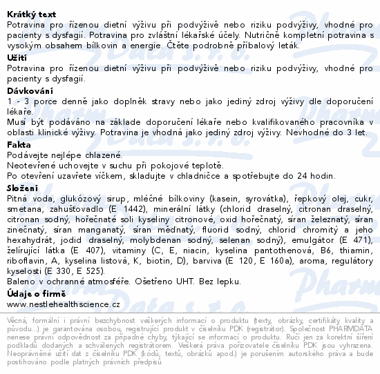 Potravina pro řízenou dietní výživu při podvýživě nebo riziku podvýživy, vhodné pro pacienty s dysfagií. Potravina pro zvláštní lékařské účely. Nutričně kompletní potravina s vysokým obsahem bílkovin a energie. Čtěte pozorně příbalový leták.