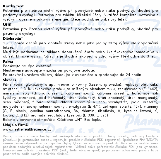 Potravina pro řízenou dietní výživu při podvýživě nebo riziku podvýživy, vhodné pro pacienty s dysfagií. Potravina pro zvláštní lékařské účely. Nutričně kompletní potravina s vysokým obsahem bílkovin a energie. Čtěte pozorně příbalový leták.