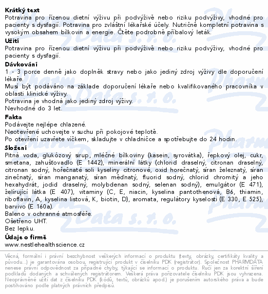 Potravina pro řízenou dietní výživu při podvýživě nebo riziku podvýživy, vhodné pro pacienty s dysfagií. Potravina pro zvláštní lékařské účely. Nutričně kompletní potravina s vysokým obsahem bílkovin a energie. Čtěte pozorně příbalový leták.