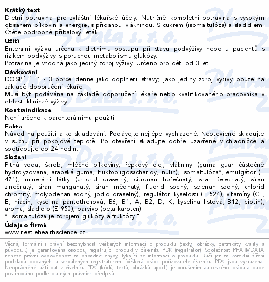 Dietní potravina pro zvláštní lékařské účely. Nutričně kompletní potravina s vysokým obsahem bílkovin a energie, s přidanou vlákninou. S cukrem (isomaltulóza) a sladidlem. Čtěte pozorně příbalový leták.